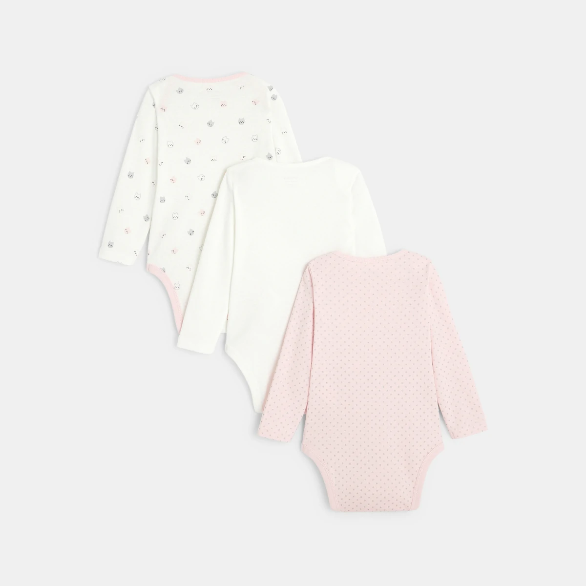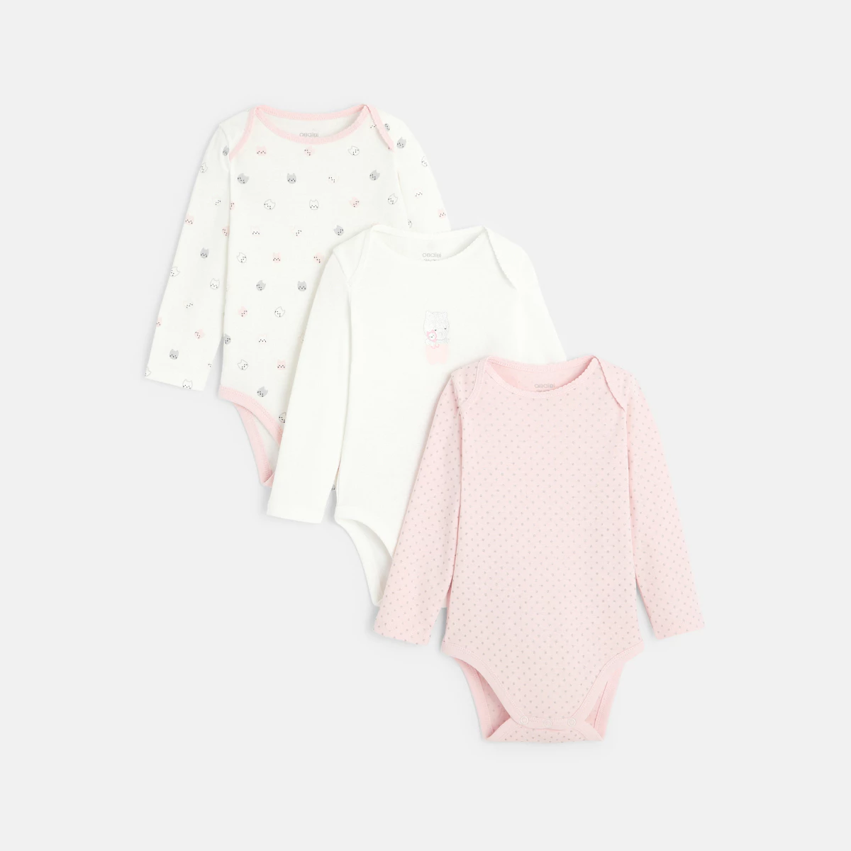 Long-sleeved bodysuits with a practical American collar and featuring either printed cats or micro polka dots for little girls. A soft jersey and a comfortable fit. The set includes three assorted bodysuits.