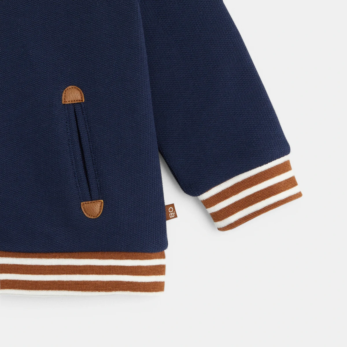 With its hoodie design this sportswear bodywarmer keeps boys warm in style. Inside made of brushed washed fleece for even more softness. Stylised varsity jacket bear patch on the back. Striped ribbed trim on the collar hem and cuffs for a baseball jacket effect. Hood can be removed and attaches with poppers. Zip fastening.
