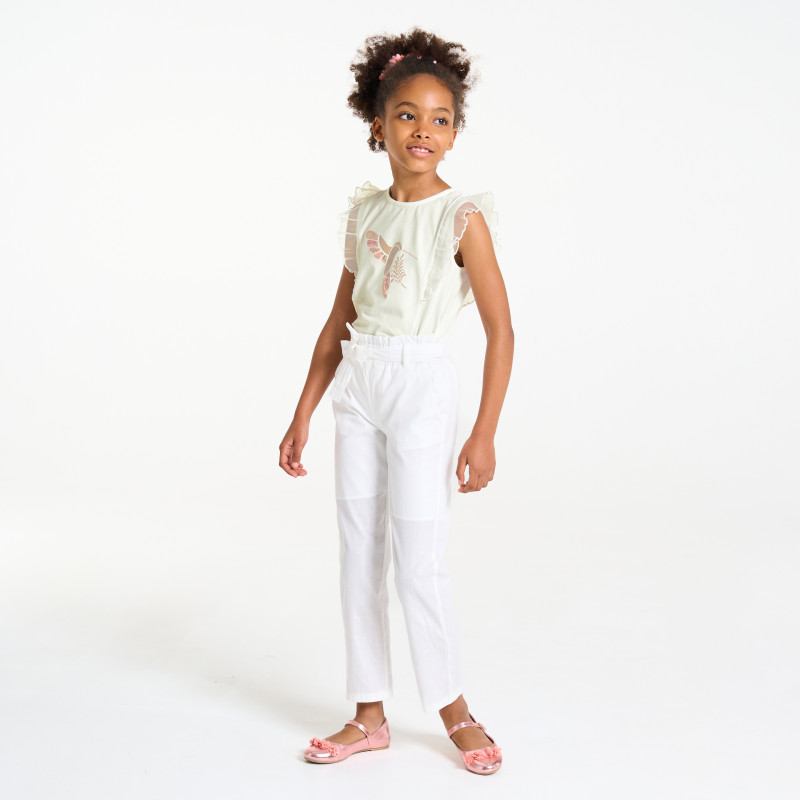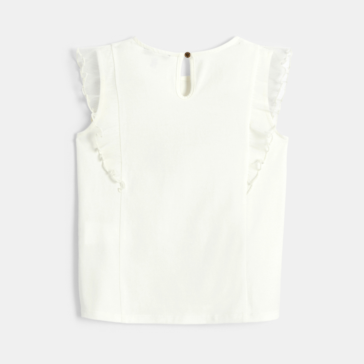 The hummingbird is embellished with embroidered sequins. The armholes feature tulle ruffles. The teardrop cut-out at the nape of the neck makes it easy to pull on. Soft cotton jersey. Straight cut. Tone-on-tone stitching.