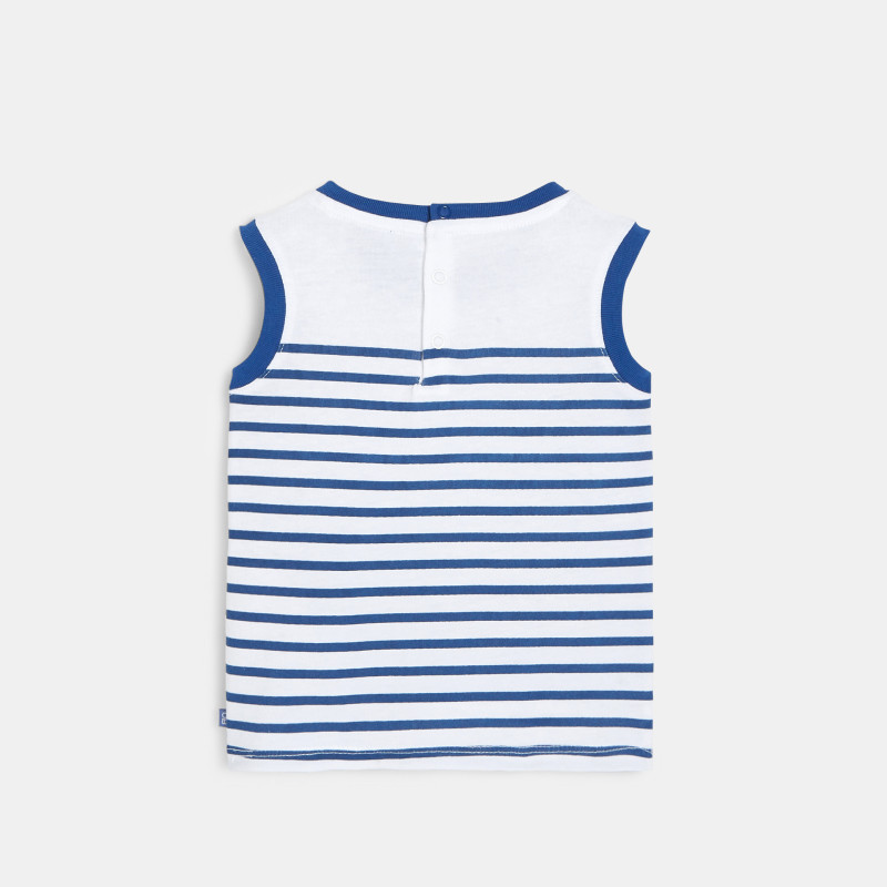 Sleeveless tank top-style t-shirt for baby boys. Jersey knit fabric made with Act for Kids organic cotton fibers. Dyed-thread stripes. Round neckline and armholes with ribbed finish in solid color. Snap fastenings to fit easily over the head. Straight fit. Small Obaïbi label.
