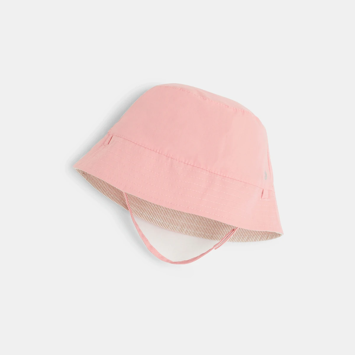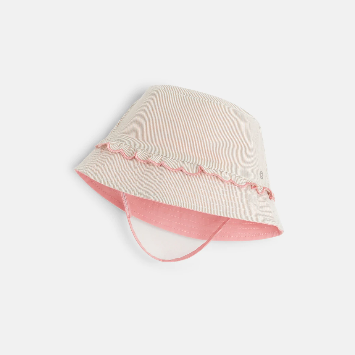 Le chapeau de soleil des coquettes : un recto finement rayé à volant et un verso uni rose pour changer de tête sans changer de chapeau ! Chapeau de soleil forme bob en tissu double épaisseur pour un recto-verso facile. Maintenu par bride à scratch.