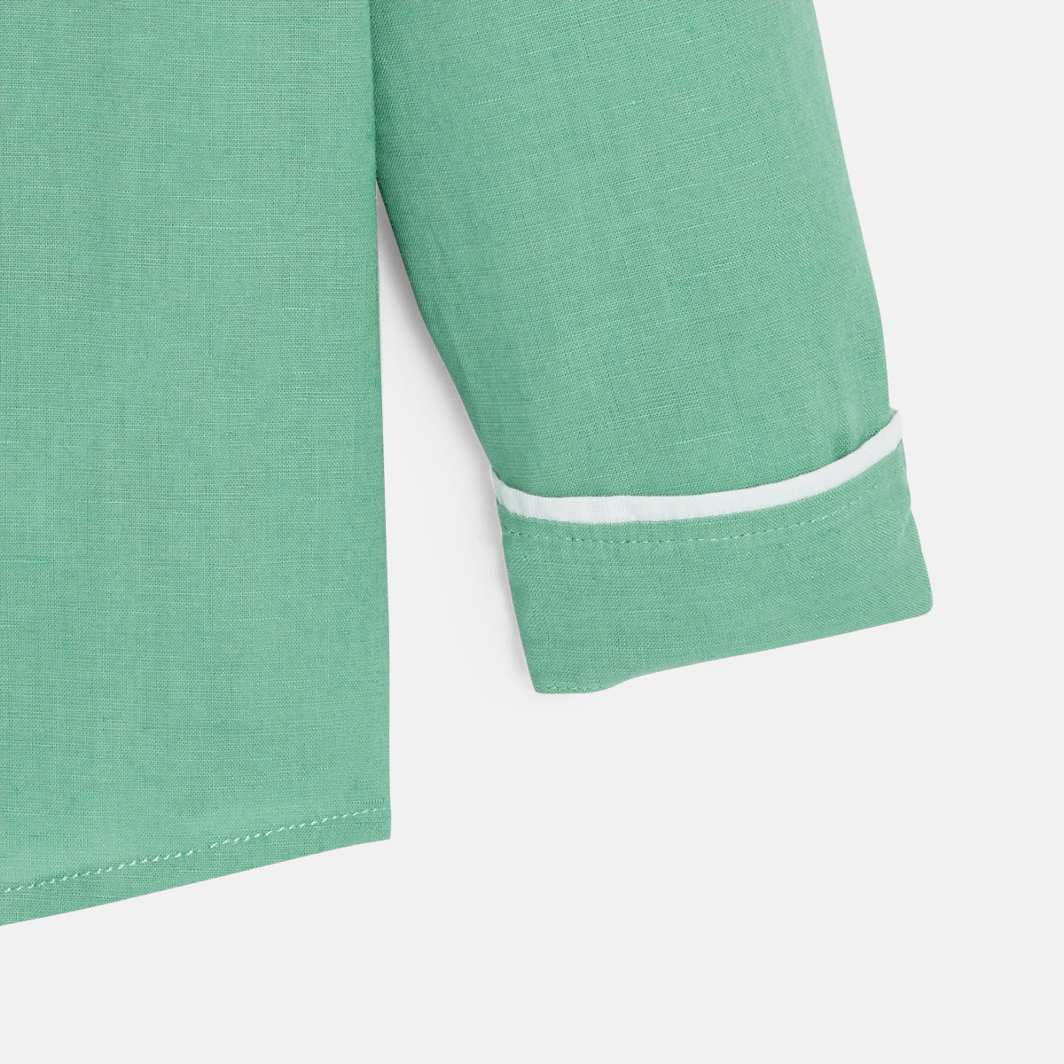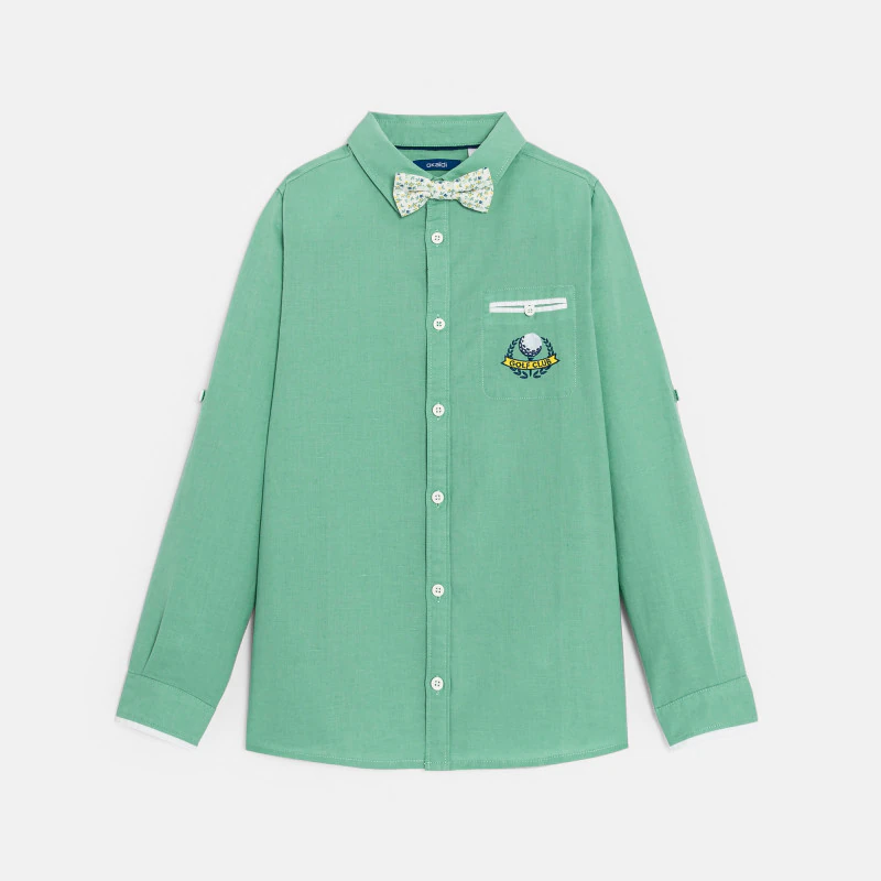 Cette chemise vert d'eau collectionne les bons détails chics : un nœud papillon fleuri (amovible) une broderie sur sa poche poitrine et des biais en finition à l'intérieur du col et des poignets boutonnés. Popeline de coton. Coupe droite. Col chemise. Ouverture boutonnée. Manches longues à retrousser sous patte boutonnée. Base légèrement arrondie.