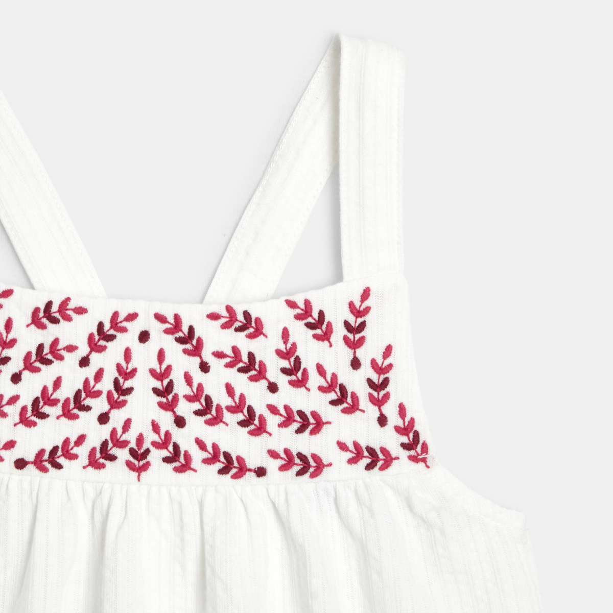 Fraîcheur et originalité : ce top à bretelles est léger doux et agréable à porter. Il est confectionné dans un coton gaufré doublé. Les broderies fleuries personnalisent ce modèle blanc. Coupe évasée. Dos droit élastiqué.n