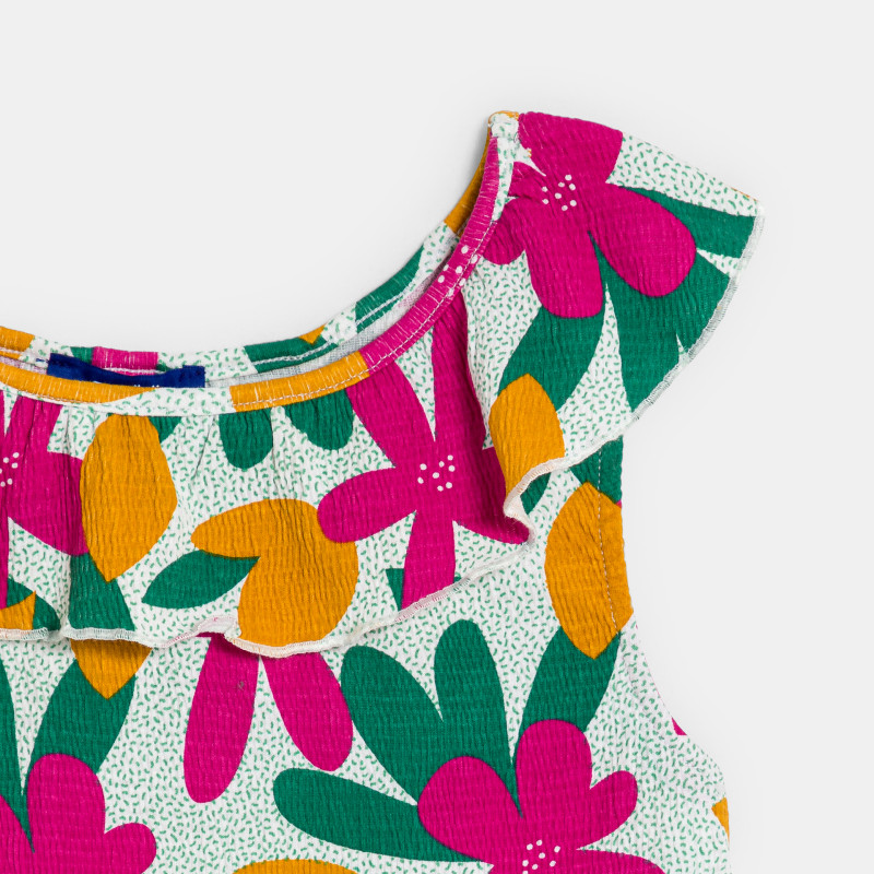 Maille gaufrée et motifs colorés : ce débardeur met du peps dans les looks de la belle saison ! Le col rond volanté est un petit plus qui change tout. Parfait avec un bas uni et un chapeau de soleil. Motifs imprimés. Coupe droite. Emmanchures américaines.