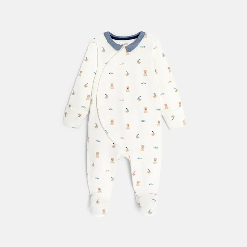Pour réchauffer les nuits des garçons et leur assurer douceur et confort ce pyjama forme une pièce est un must dans le vestiaire des petits. Illustré de bateaux de poissons et d'ourson avec un petit col contrasté. Ouverture pressionnée devant pour habiller les petits sur le dos.