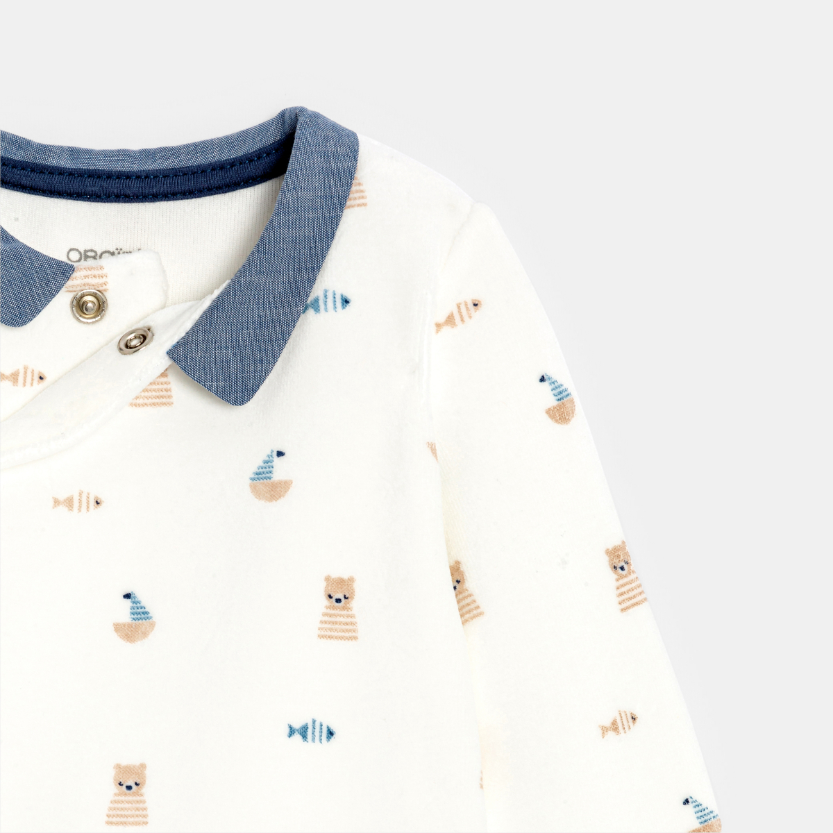Pour réchauffer les nuits des garçons et leur assurer douceur et confort ce pyjama forme une pièce est un must dans le vestiaire des petits. Illustré de bateaux de poissons et d'ourson avec un petit col contrasté. Ouverture pressionnée devant pour habiller les petits sur le dos.