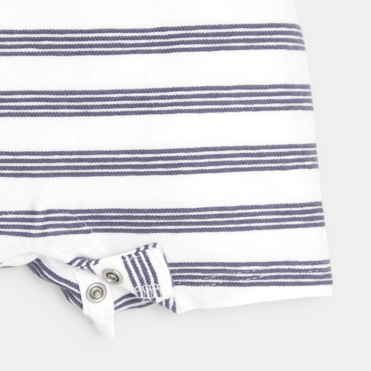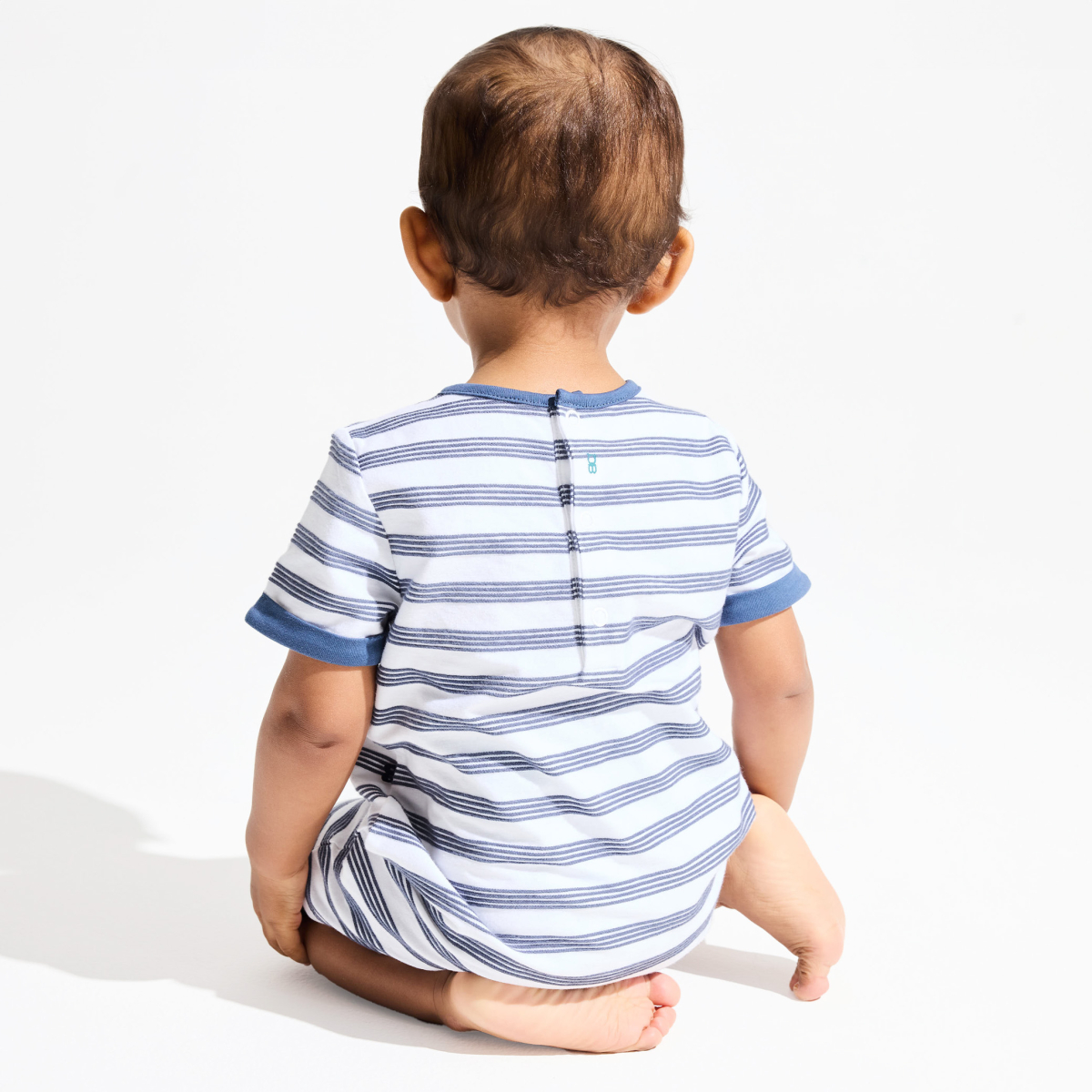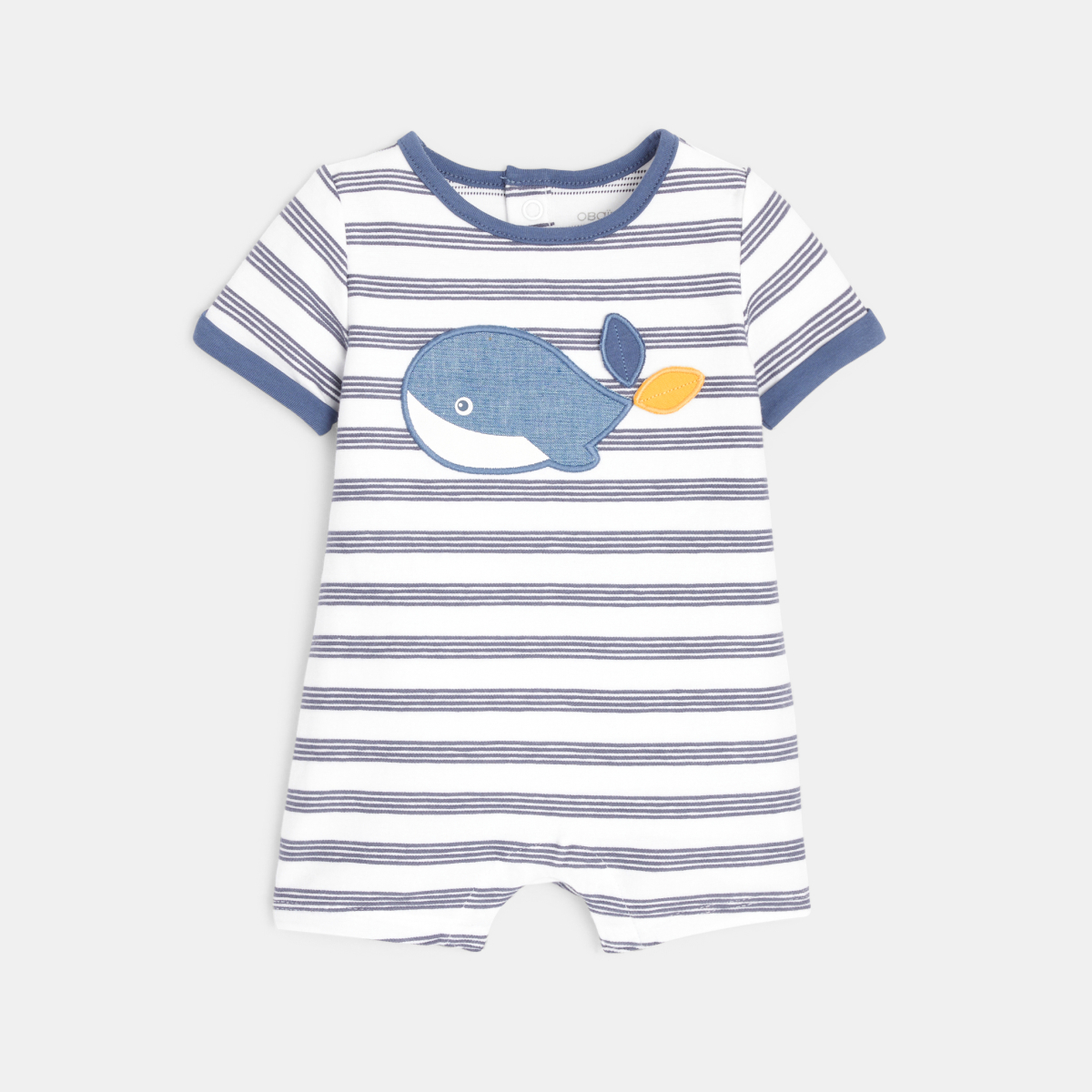 Pour les journées chaudes ou les nuits paisibles cette combinaison courte a tout bon. Un coton doux sur la peau des garçons une rayure légèrement en relief des manches courtes et une jolie baleine brodée qui amuse les petits fans d'animaux. Pour un habillage facile pressions au dos et à l'entrejambe.