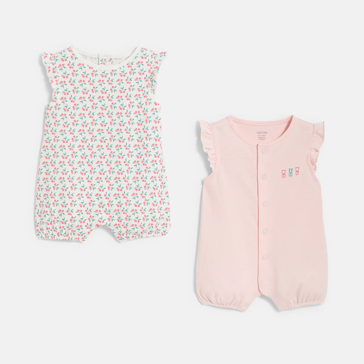 Les coquettes apprécient le confort et le style de ces combinaisons courtes ! Un modèle fleuri et un uni avec des manches courtes volantées et des cuisses élastiquées pour des journées en toute liberté. Fermeture par pressions dos ou devant en fonction du modèle.