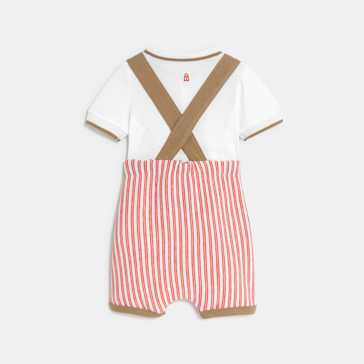 Un molleton doux fantaisie qui entoure les petits de confort et une rayure intemporelle qui apporte du peps à la tenue : voilà la salopette courte préférée de la saison ! Avec son body à petit col et manches courtes pressionné devant c'est la tenue idéale des garçons pour une journée chic.