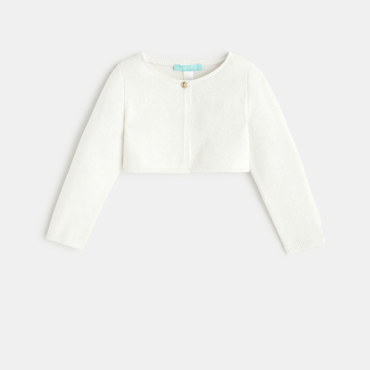 Description Pour habiller une tenue chic et réchauffer les petites ce gilet court style boléro apporte une touche élégante lors des évènements. En tricot point mousse avec manches longues. Fermeture par un bouton devant.