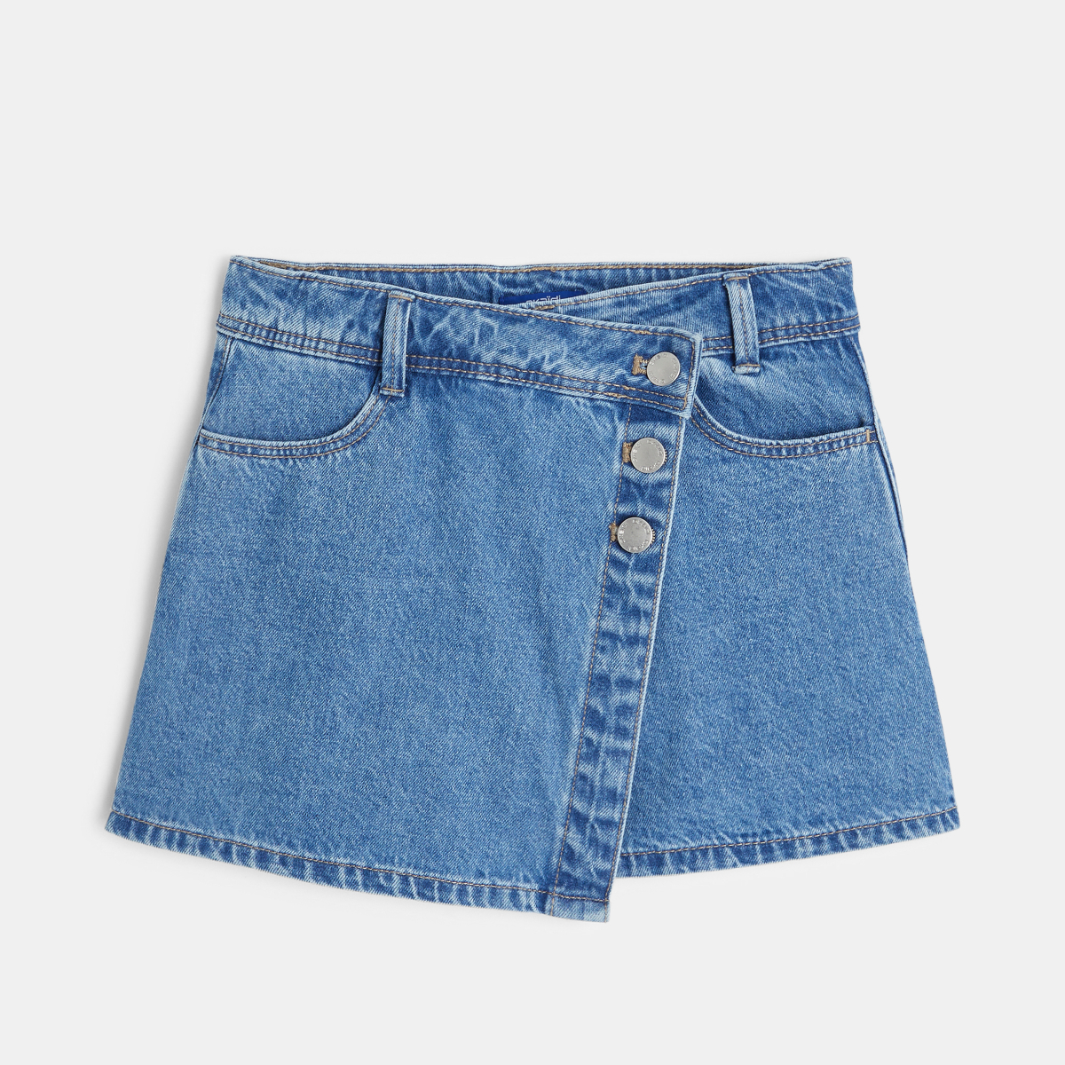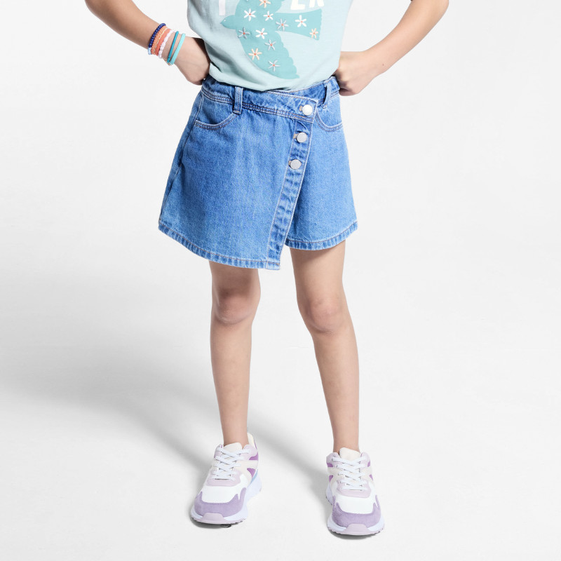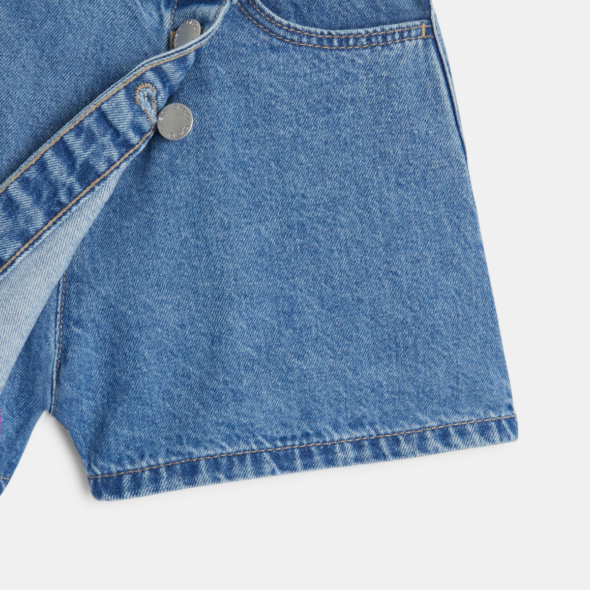On dirait une mini-jupe mais pour le confort des filles c'est un short super pratique pour jouer courir et faire les 400 coups tout l'été ! Denim délavé. Coupe trapèze. Passants. Pan boutonné devant. Tour de taille ajustable par élastique boutonné. Finition surpiquée.