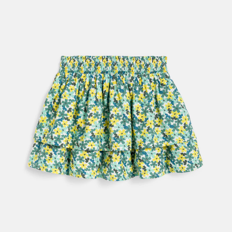 Les filles craquent pour la fraîcheur des imprimés fleuris dans une déclinaison de nuances vert & jaune. Jupe coupe évasée et volantée. Longueur au-dessus du genou. Taille entièrement élastiquée. Base arrondie. Coutures ton sur ton.