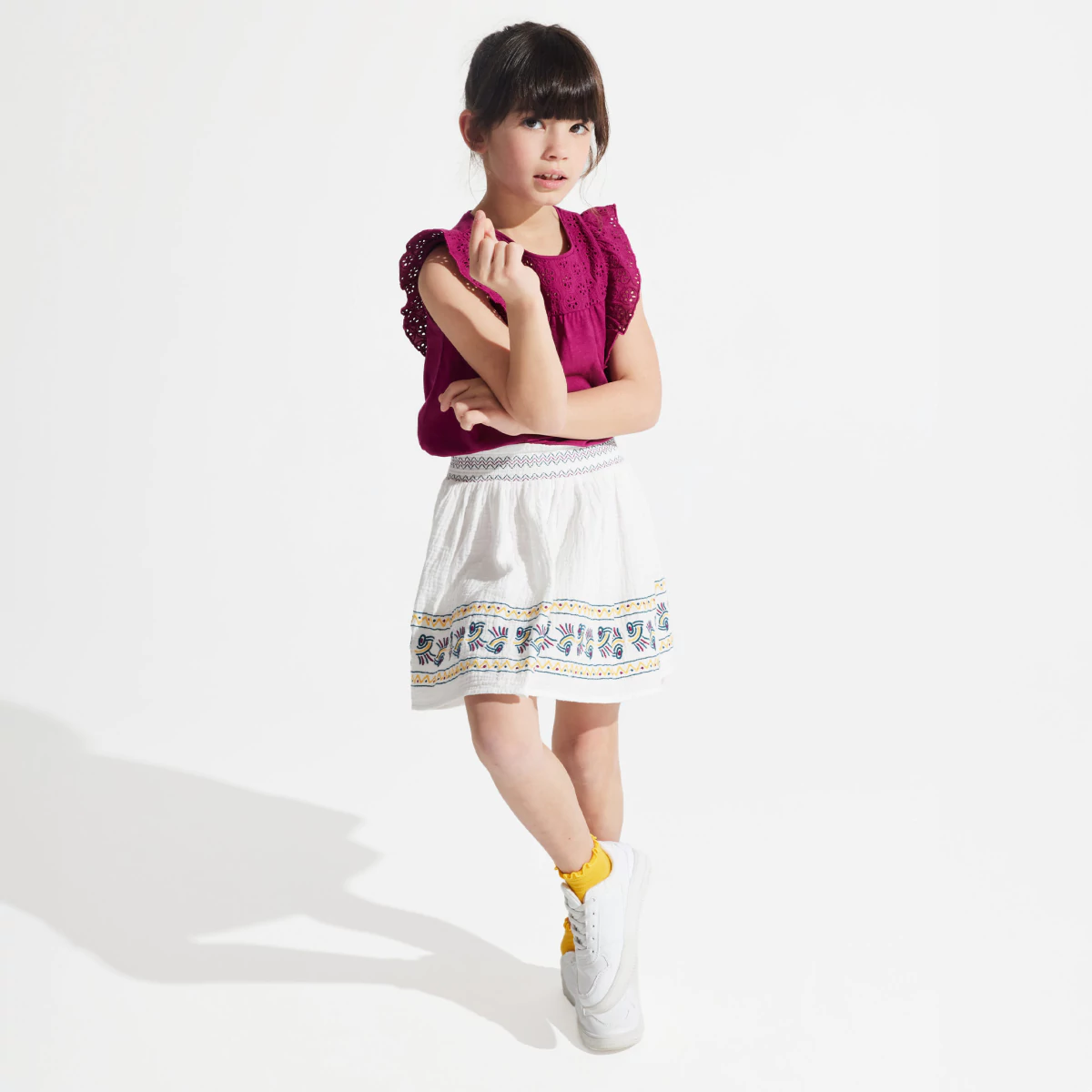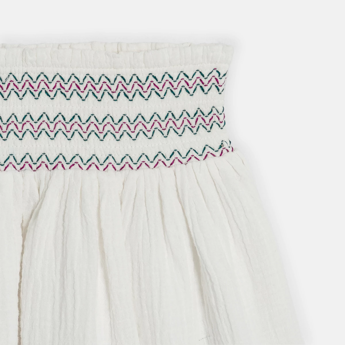 Les filles convoquent l'esprit folk et dansent de plus belle avec cette jupe blanche brodée courte et évasée. Double gaze de coton matière douce et légèrement gaufrée. Coupe évasée. Taille haute smockée élastiquée et brodée. Base brodée. Doublure.