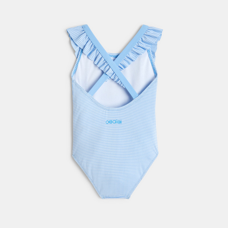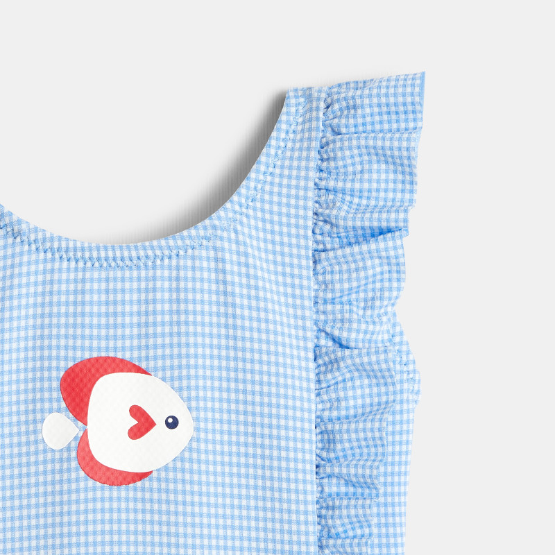 Pour les coquettes qui mixent style et confort même sous le parasol ce maillot de bain une pièce est indispensable dès les beaux jours. Imprimé à carreaux esprit vichy et volants de chaque côté pour un effet rétro plein de charme. Petit poisson imprimé. Entièrement doublé.nnCe maillot de bain a obtenu le Prix PARENTS des experts de la rédaction. Ce prix récompense des produits qui répondent à des critères précis et incontournables tels que la sécurité la praticité et lu2019innovation.