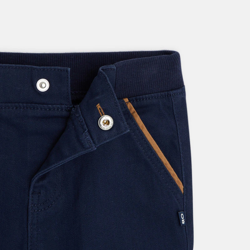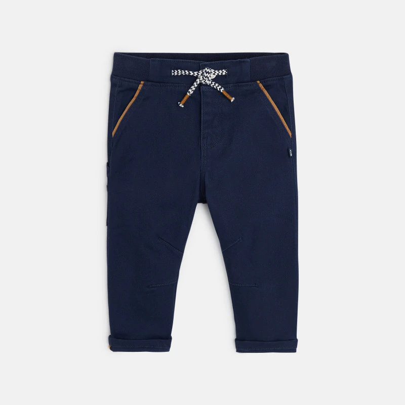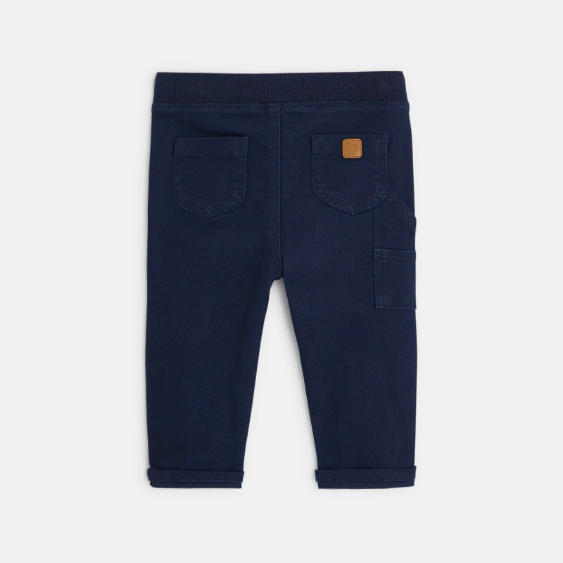 Ultra confort au rendez-vous avec ce pantalon en twill souple. Vite enfilé grâce à sa ceinture élastiquée. Découpes style worker aux genoux revers bas de jambes et poches passepoilées.