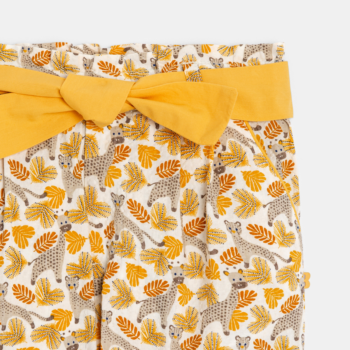 Un modèle ample tout confort à l'imprimé savane qui séduit les petites filles. Pantalon en tissu fantaisie gaufré avec ceinture contrastée à nouer. Taille élastiquée et revers bas de jambes.