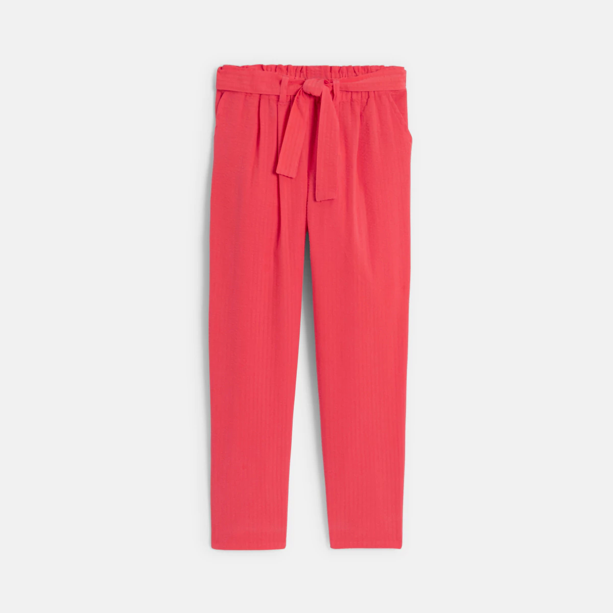 Ce pantalon en toile de coton a tous les atouts recherchés : du confort avec sa taille paper bag élastiquée du style avec sa couleur rouge coquelicot ! Effet tramé gaufré. Passants. Ceinture amovible. 2 poches. Coutures ton sur ton.