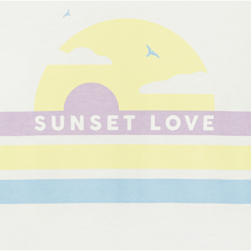 Ambiance Californie ! Effet délavé coucher de soleil et couleur pastel. Pour des nuits douces et des matins câlins. Ce pyjama d'été en jersey doux est composé de deux pièces : un t-shirt à message (coupe droite col rond et manches courtes) et un short uni coordonné (taille élastiquée bas de jambes volantés).
