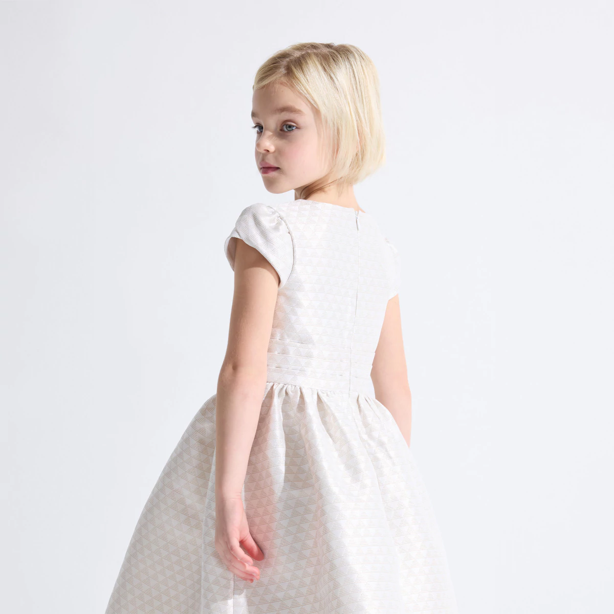 Esprit Couture et élégance évidente : cette robe de fête écru irisé expose un beau motif fleuri rétro effet brocart. Coupe ajustée sur le buste et évasée sous la taille marquée d'un jeu de plis. Encolure arrondie ouverture par zip invisible dans le dos enfilage facile. Mancherons. Longueur genou.