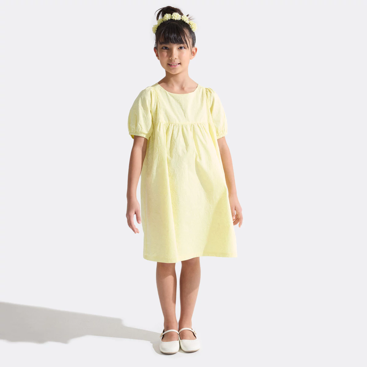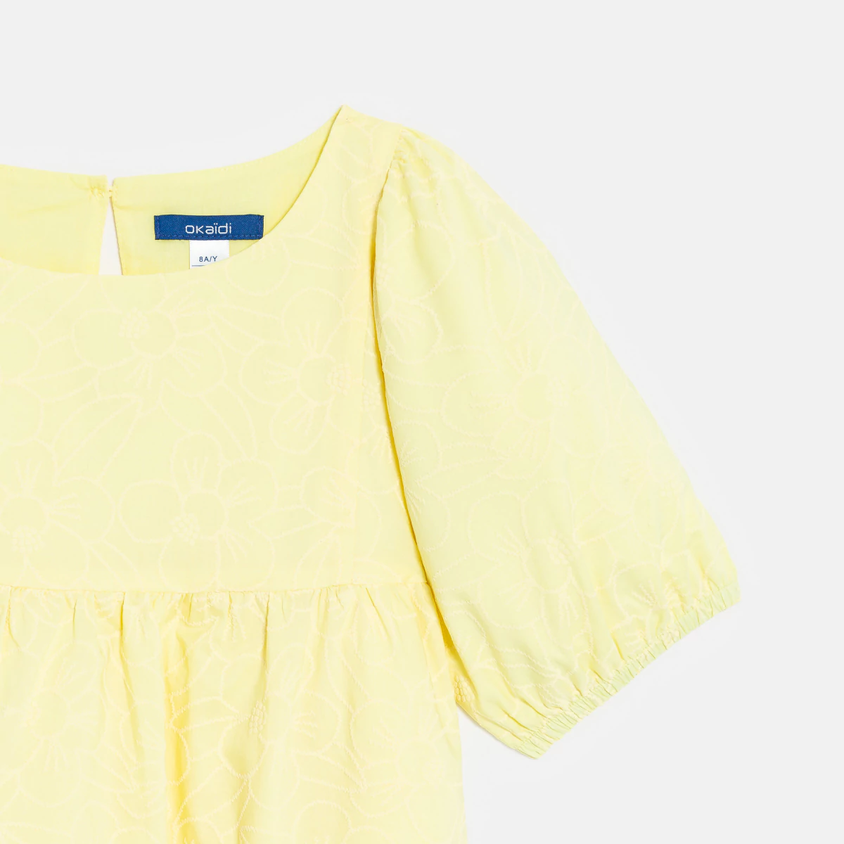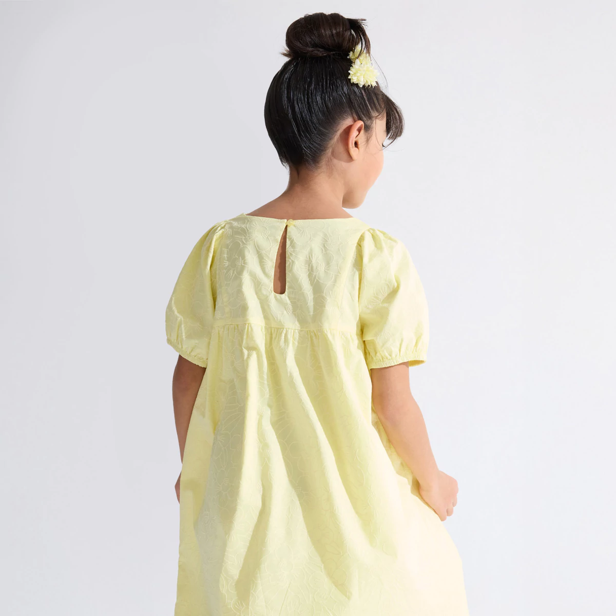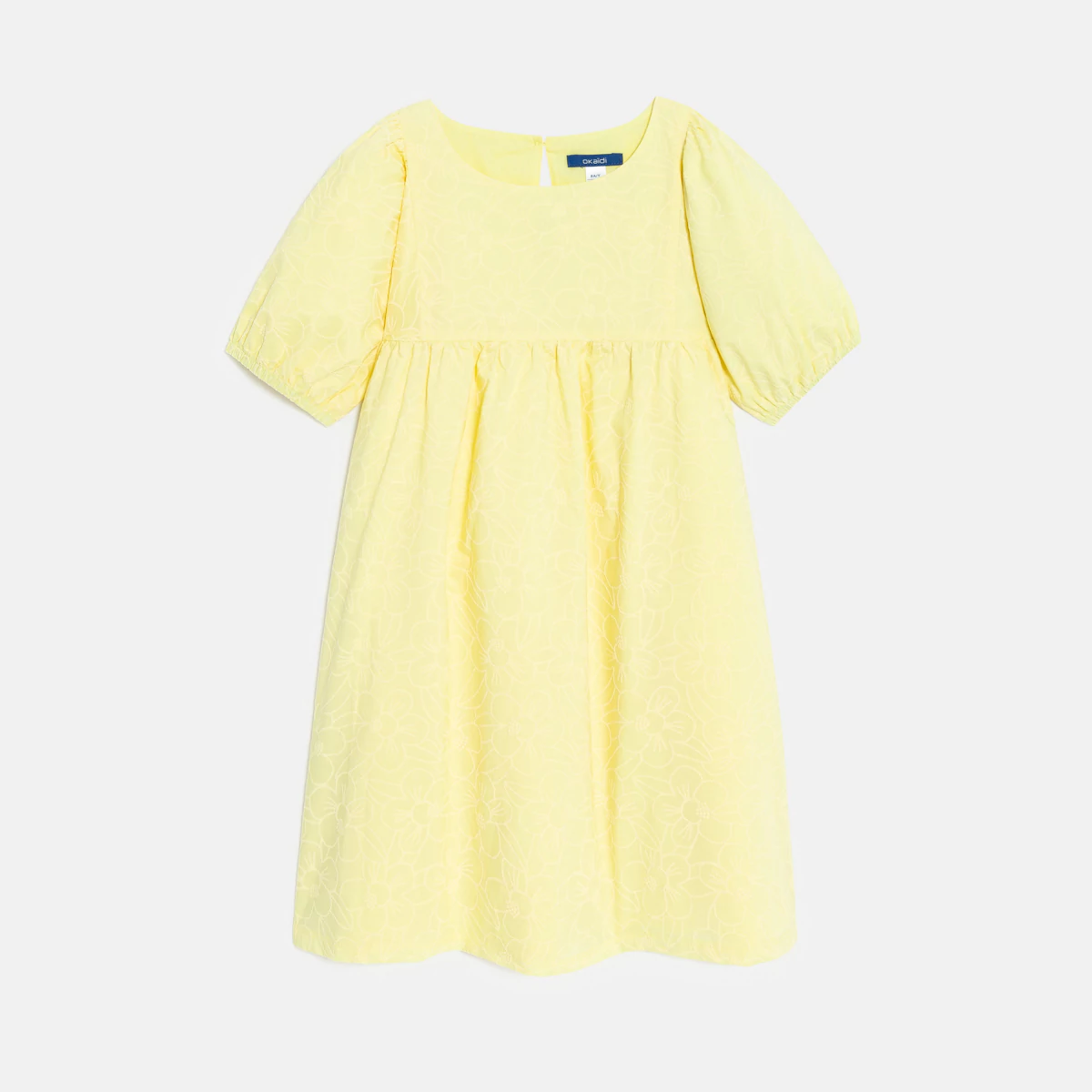 Pour une cérémonie ou pour profiter de l'été cette robe jaune est un rayon de soleil ! On zoome sur les motifs fleuris en ton sur ton qui imitent la broderie. Popeline de coton. Coupe évasée. Encolure arrondie découpe goutte boutonnée dos. Manches courtes ballon élastiquées. Doublure. Longueur dessus genou.
