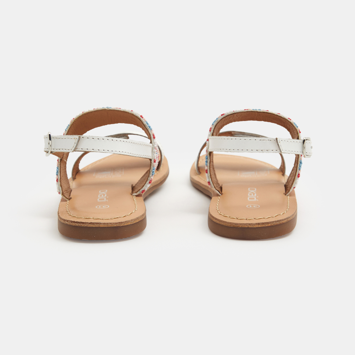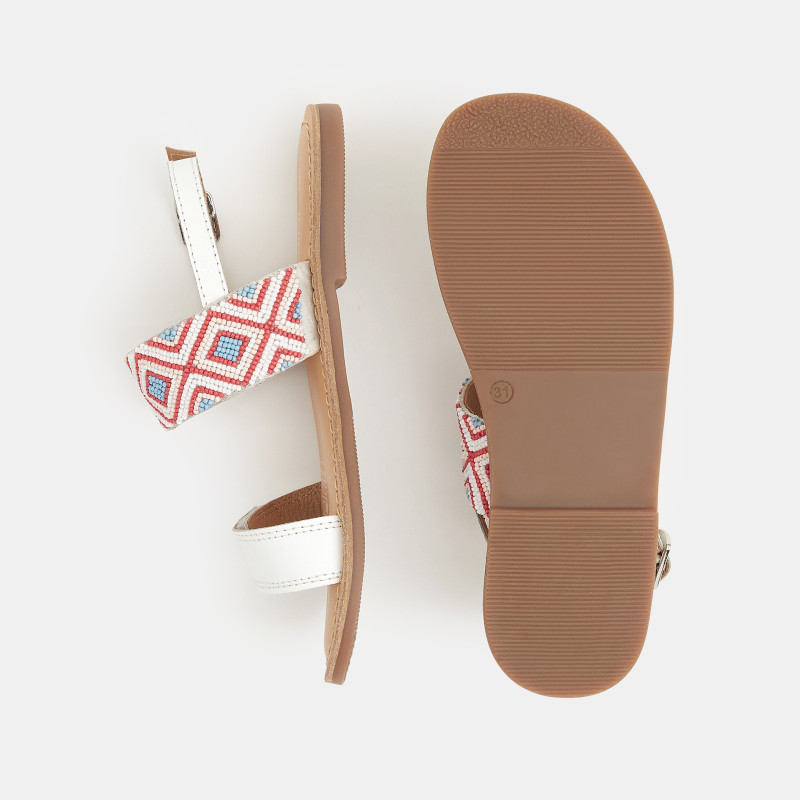 On adore les perles de rocaille tressées qui ornent ces sandales ! Un petit look vintage sur une chaussure ouverte indispensable dès les beaux jours. Et pour se chausser rapidement une bride à la cheville et un scratch aux orteils et les filles peuvent partir en balade ! Semelle et lanières en cuir.