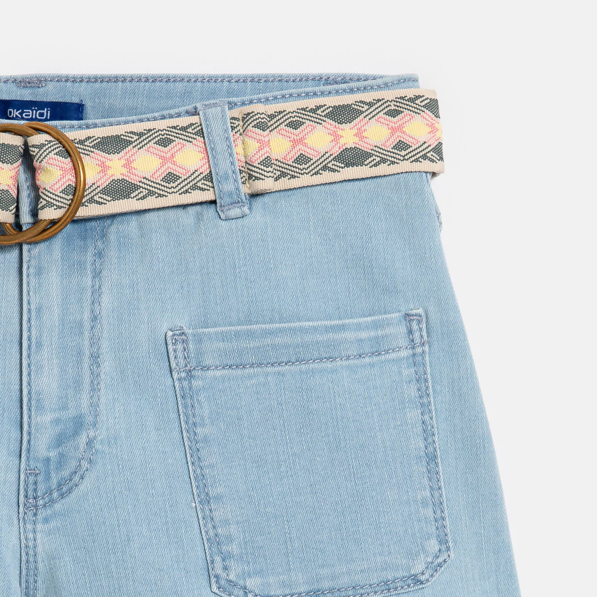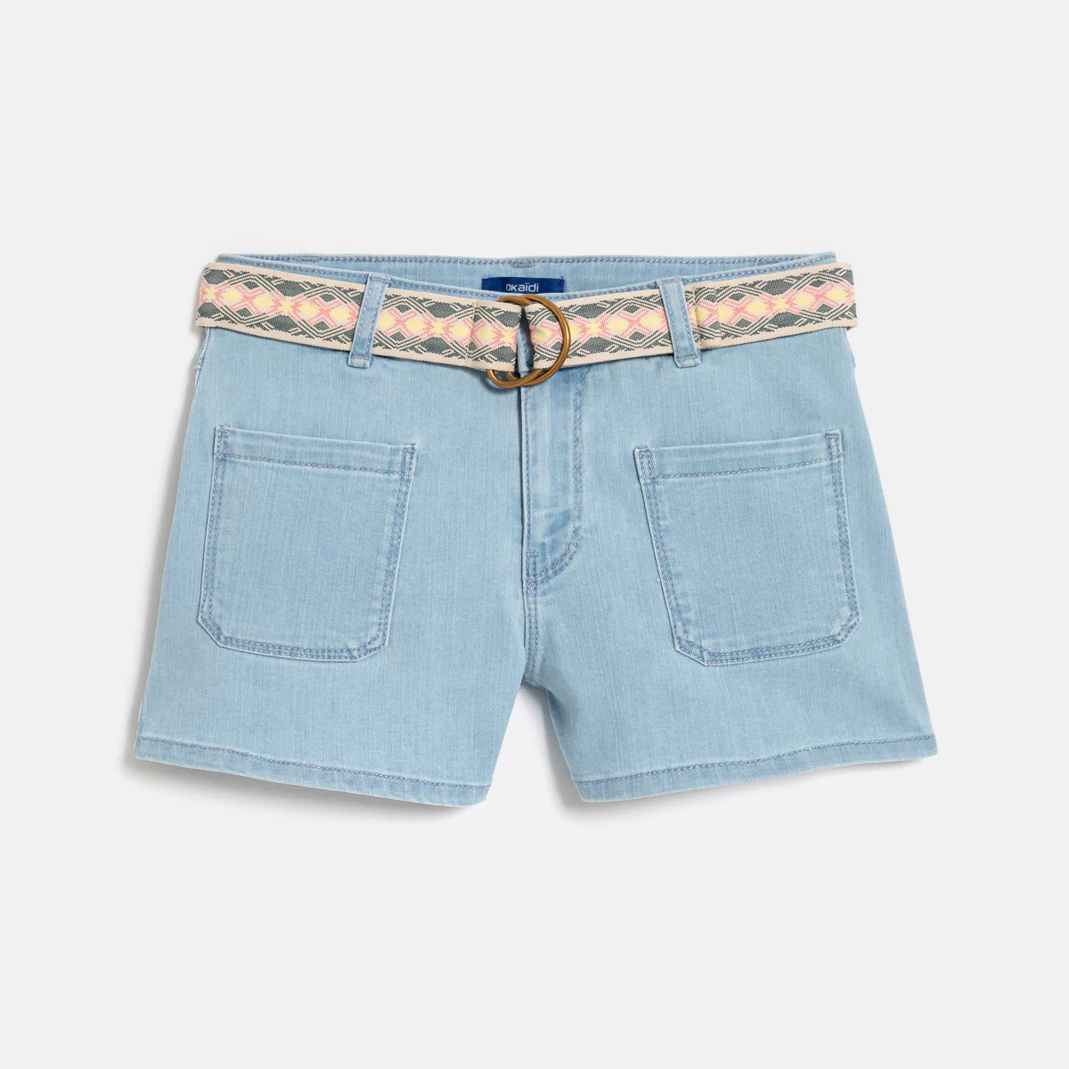 Avec ses deux poches plaquées devant il a un petit air 70's. Ce short en jean clair est confectionné dans un denim stretch tout confort. Les filles le portent avec ou sans sa ceinture brodée (amovible) à boucles métal. Ouverture par bouton clou et zip métal. Tour de taille ajustable. Coutures ton sur ton.