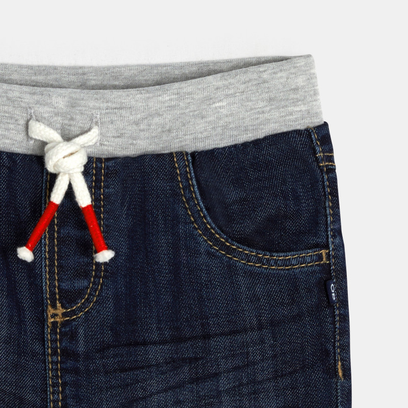 Short en jean bébé garçon. Jean denim enfibres de coton issues de l'agriculture biologique Act for Kids. Forme 4poches. Taille élastiquée sous bord-côtes confortable ajustable par élastiquesintérieurs avec lacet à nouer. Revers libre en bas de jambe. Surpiqûrescontrastantes. Vignette Obaïbi en détail.