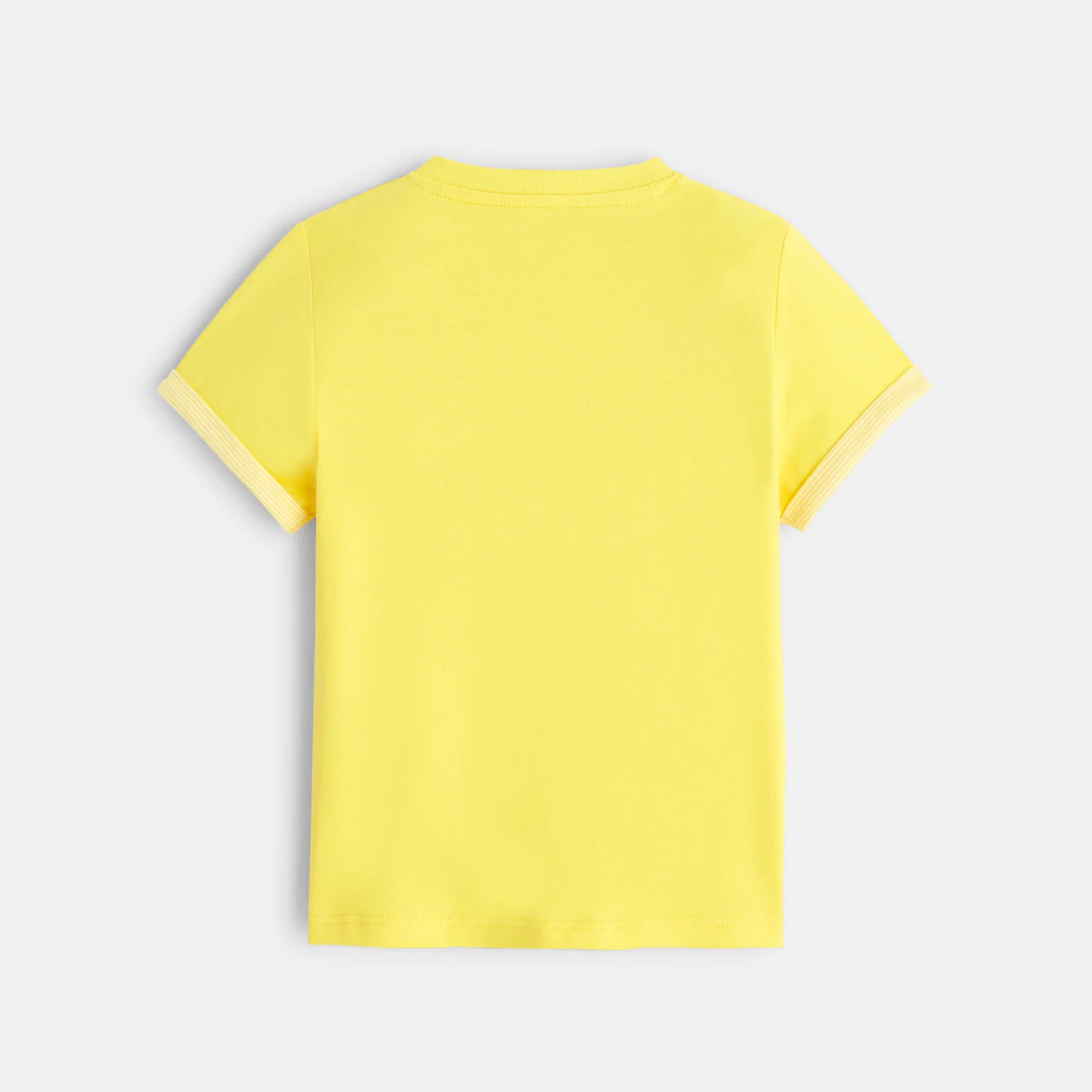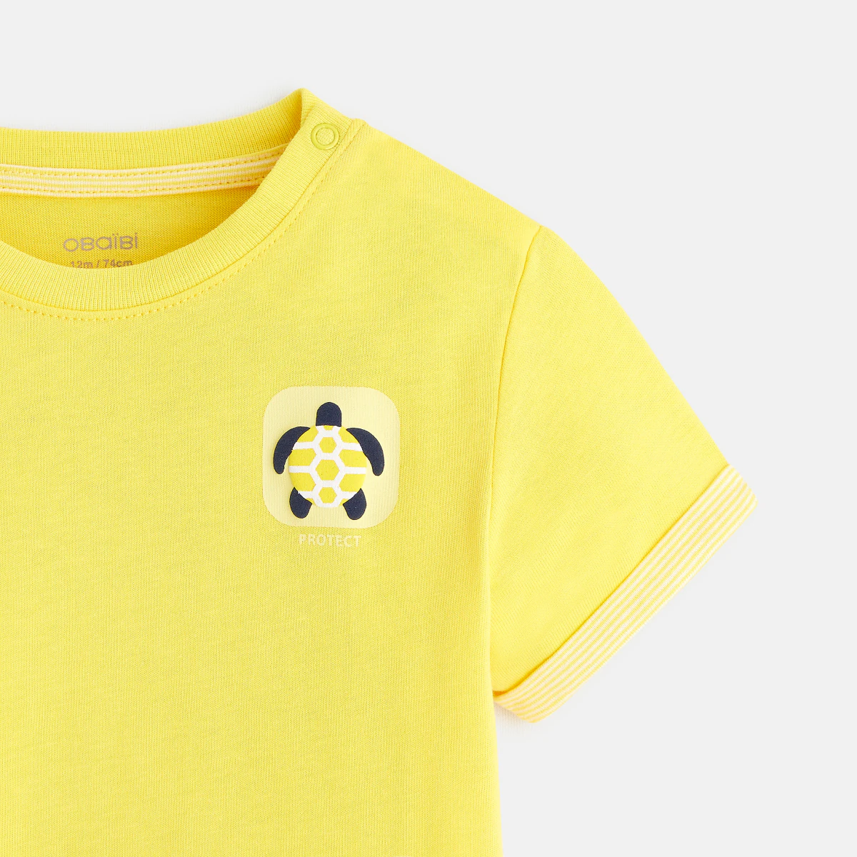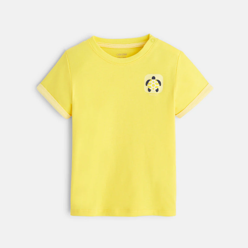 Tee-shirtmanches courtes bébé garçon. Maille jersey en fibres de coton issues delu2019agriculture biologique Act for Kids. Motif en print et gomme sur poitrinedifférent selon les coloris. Col rond finition bord-côtes pressionné épaulepour faciliter le passage de tête. Manches courtes à revers rayé piqué. Petitevignette Obaïbi en détail.