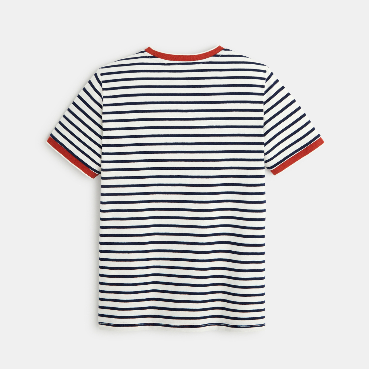 Vent marin et look plein de fraîcheur : on peut toujours compter sur le charme d'un t-shirt à rayures ! Jersey doux. Coupe droite. Col rond et bas de manches courtes animés d'un bord côtelé contrasté. Logo en détail sur la poitrine. Base droite.