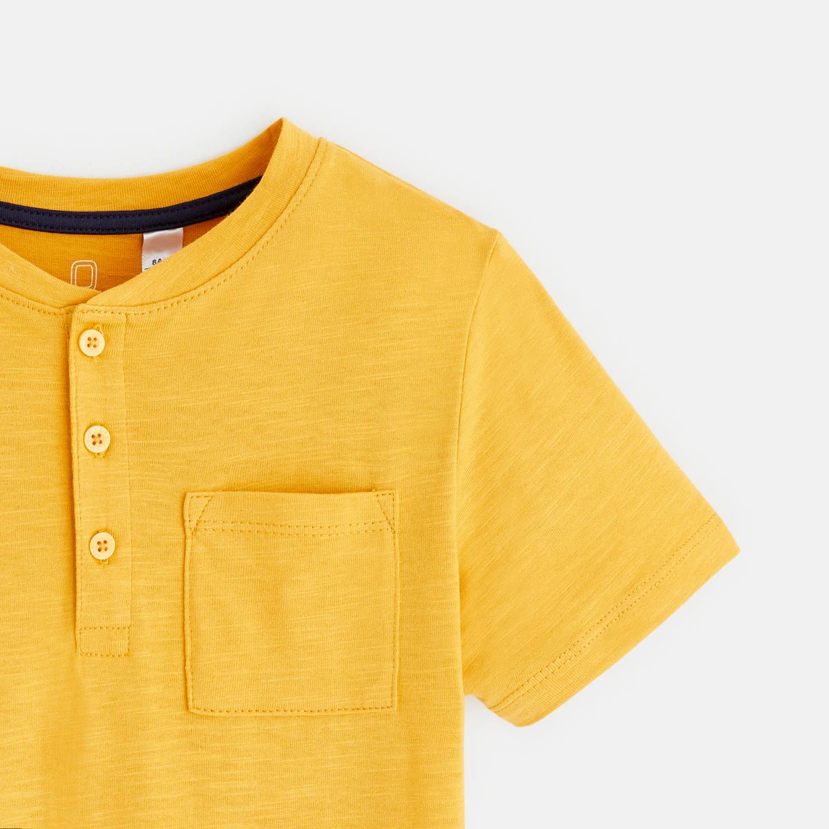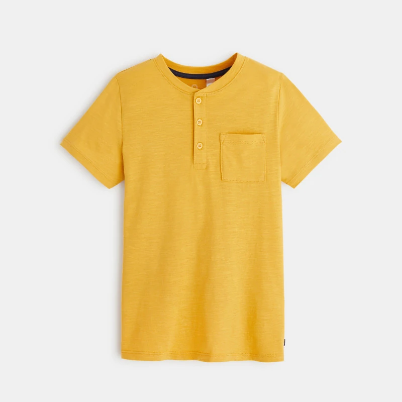 Une belle palette de coloris de saison pour la tee-shirt manches courtes à col tunisien boutonné. Un essentiel du vestiaire des garçons pour l'été en maille flammée douce et légère.