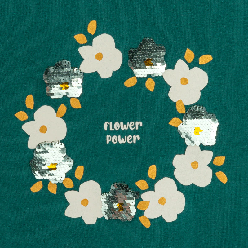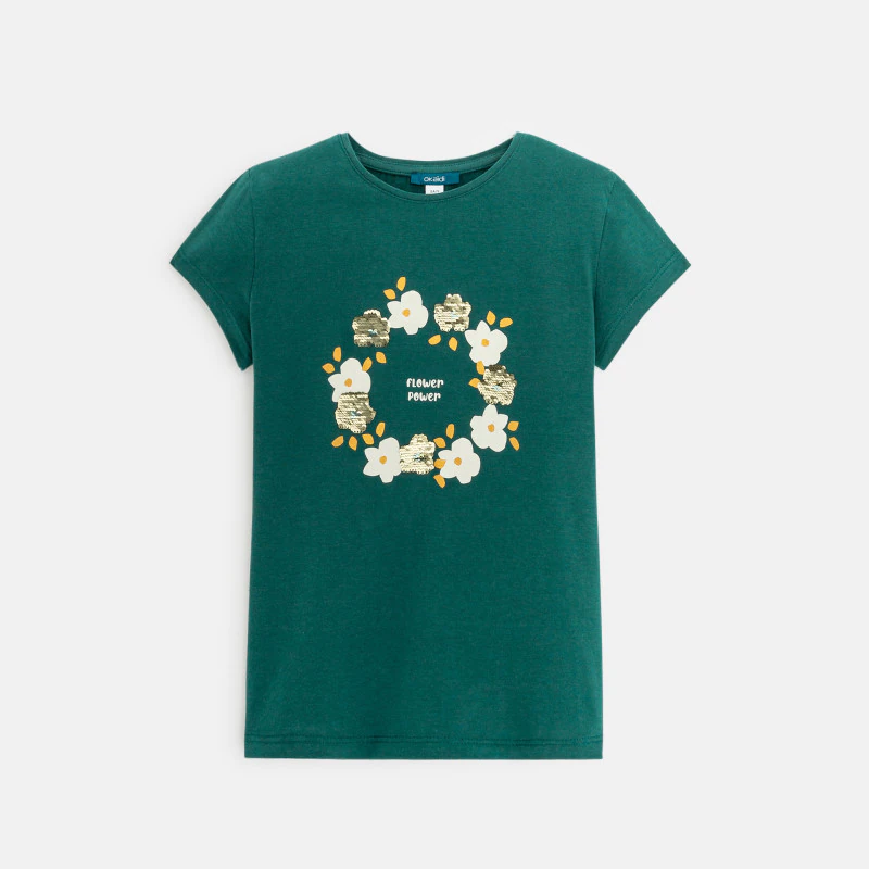 Couronne de fleurs imprimée et sequins magiques brodés : autant vous dire que ce t-shirt vert foncé est abonné au succès chez les filles ! A porter avec un short en toile une jupe en velours un jean délavé par exemple... Jersey doux. Coupe droite. Col rond. Manches courtes. Base arrondie.