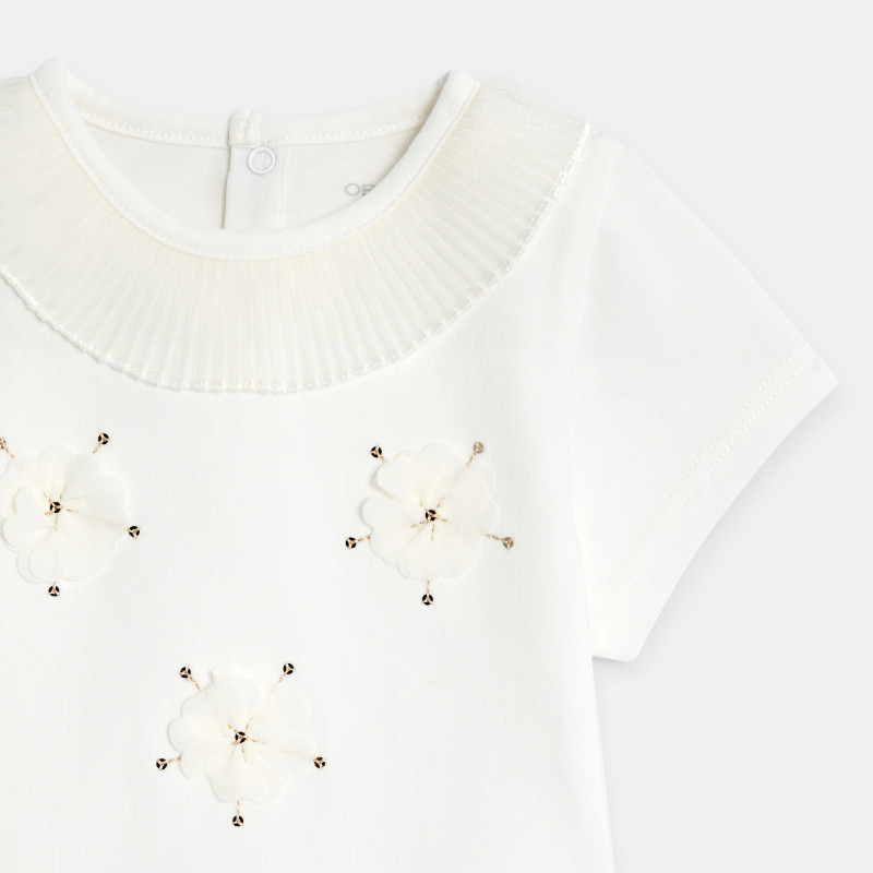 Tout en légèreté et en élégance ce tee-shirt manches courtes brille avec ses fleurs originales brodées en sequin. Les petites aiment son col pierrot froncé. Pressions dos pour un habillage facile des filles.