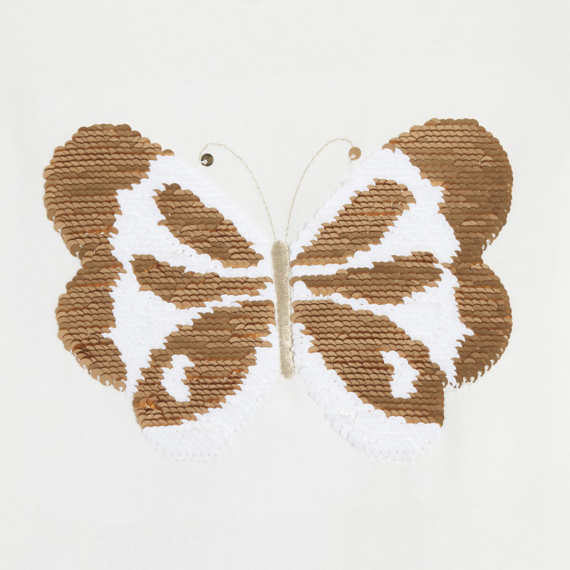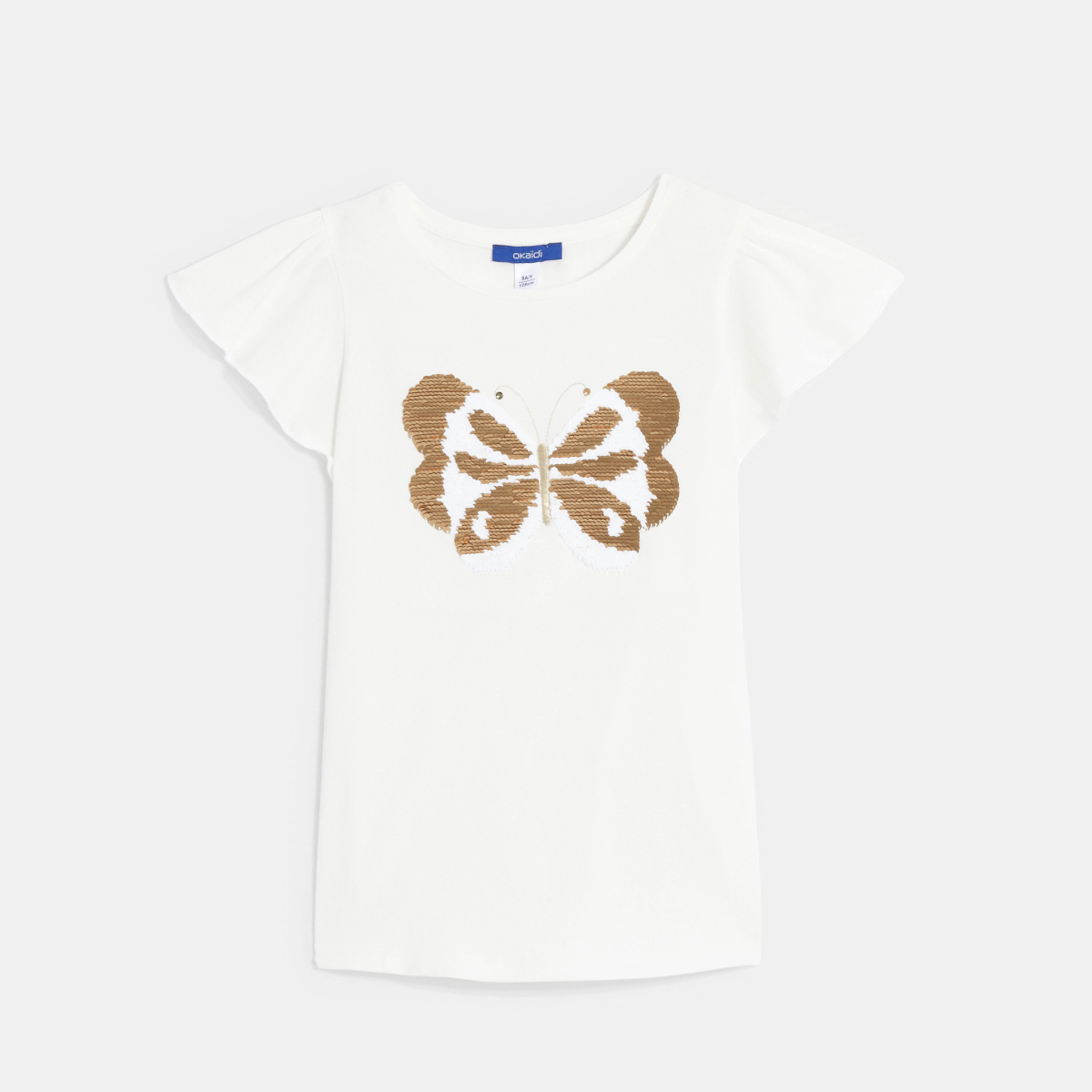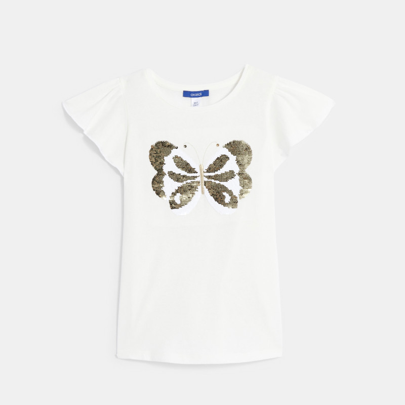 Le papillon en sequins brodés fait sensation sur ce t-shirt blanc à manches courtes volantées ! Sequins magiques : faites glisser votre main à plat sur les sequins ils se retournent et changent de couleur. Jersey doux. Coupe droite. Col rond. Manches papillon. Base légèrement arrondie. Coutures ton sur ton.
