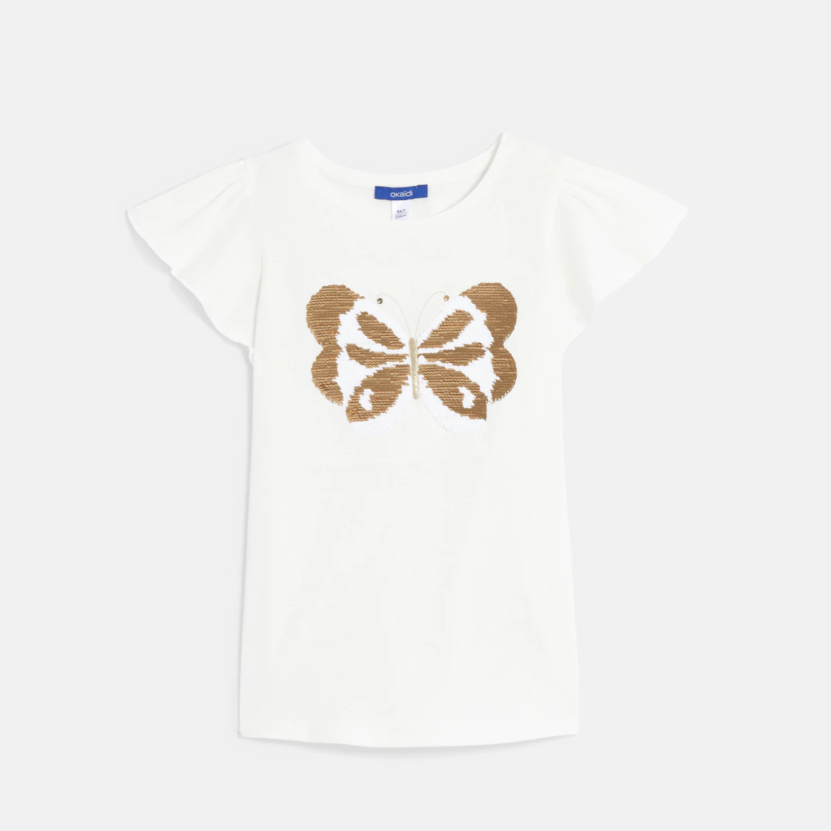 Le papillon en sequins brodés fait sensation sur ce t-shirt blanc à manches courtes volantées ! Sequins magiques : faites glisser votre main à plat sur les sequins ils se retournent et changent de couleur. Jersey doux. Coupe droite. Col rond. Manches papillon. Base légèrement arrondie. Coutures ton sur ton.