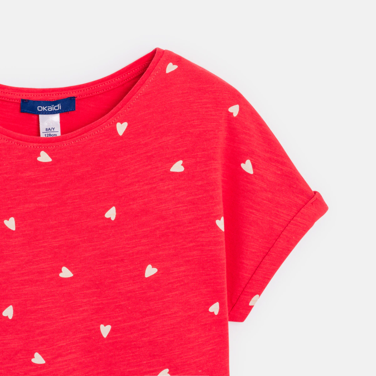 Les petits cœurs ont toujours autant de succès chez les filles. Elles disent toutes oui à ce t-shirt rouge en jersey doux imprimé. Coupe droite. Col rond. Manches courtes à revers. Base droite.