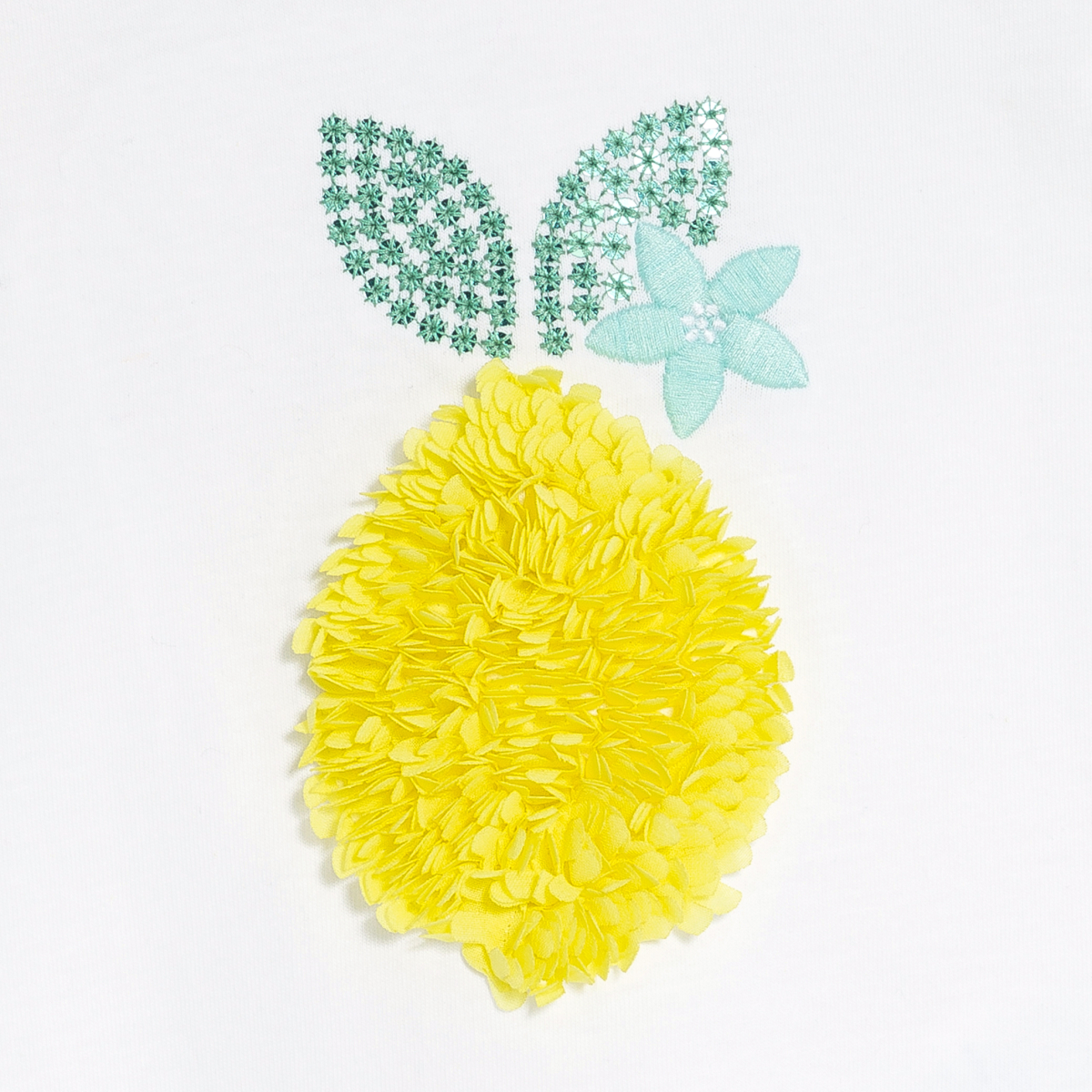 Le citron est à l'honneur dans le dressing pour le bonheur des petites sur ce tee-shirt manches courtes élégant. On adore ses détails brodés son citron en relief et ses volants aux épaules. Passage de tête facile grâce aux pressions dos.