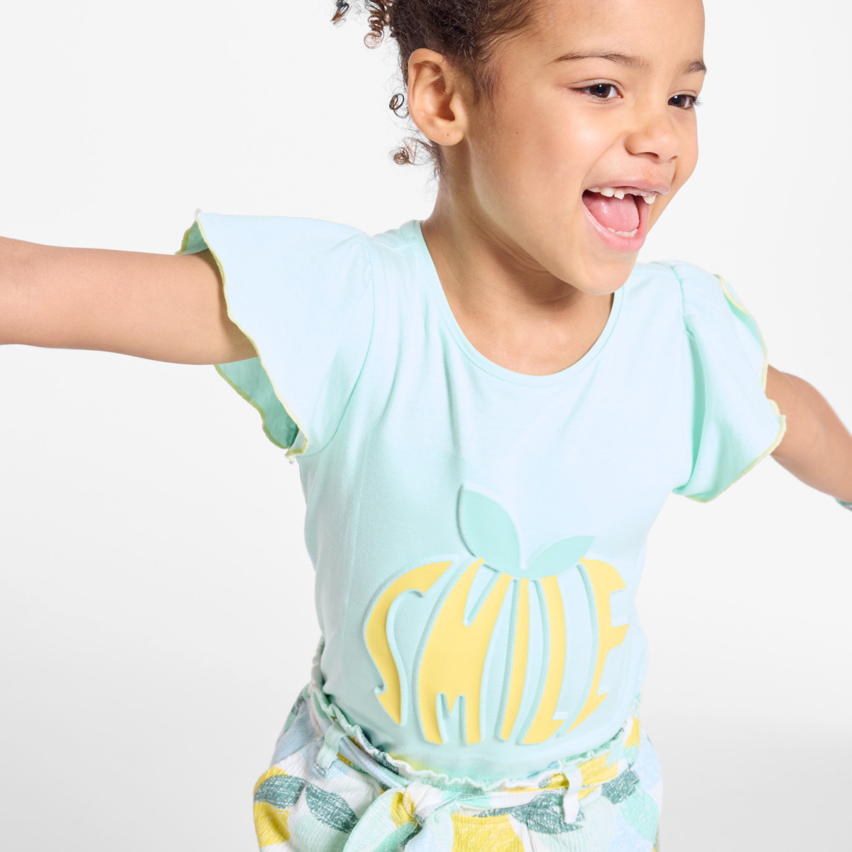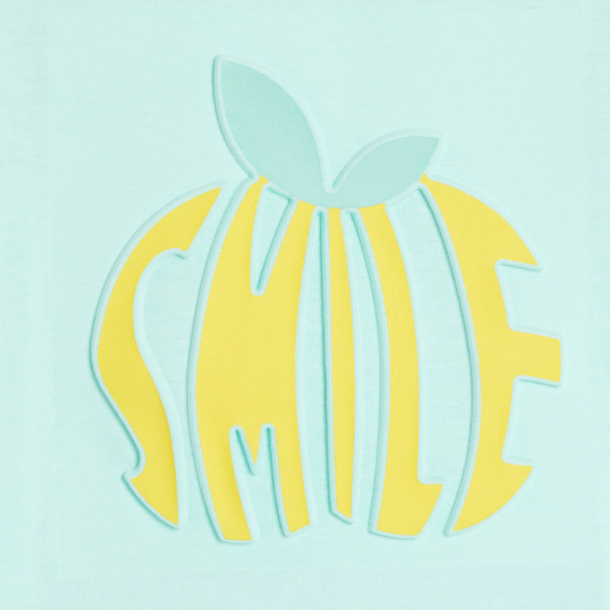 Sur ce t-shirt turquoise le message imprimé est mis en valeur par un effet en relief : c'est original et très apprécié par les filles. Jersey doux. Coupe droite. Col rond. Manches courtes papillon point bourdon contrasté en finition. Base droite surpiquée.