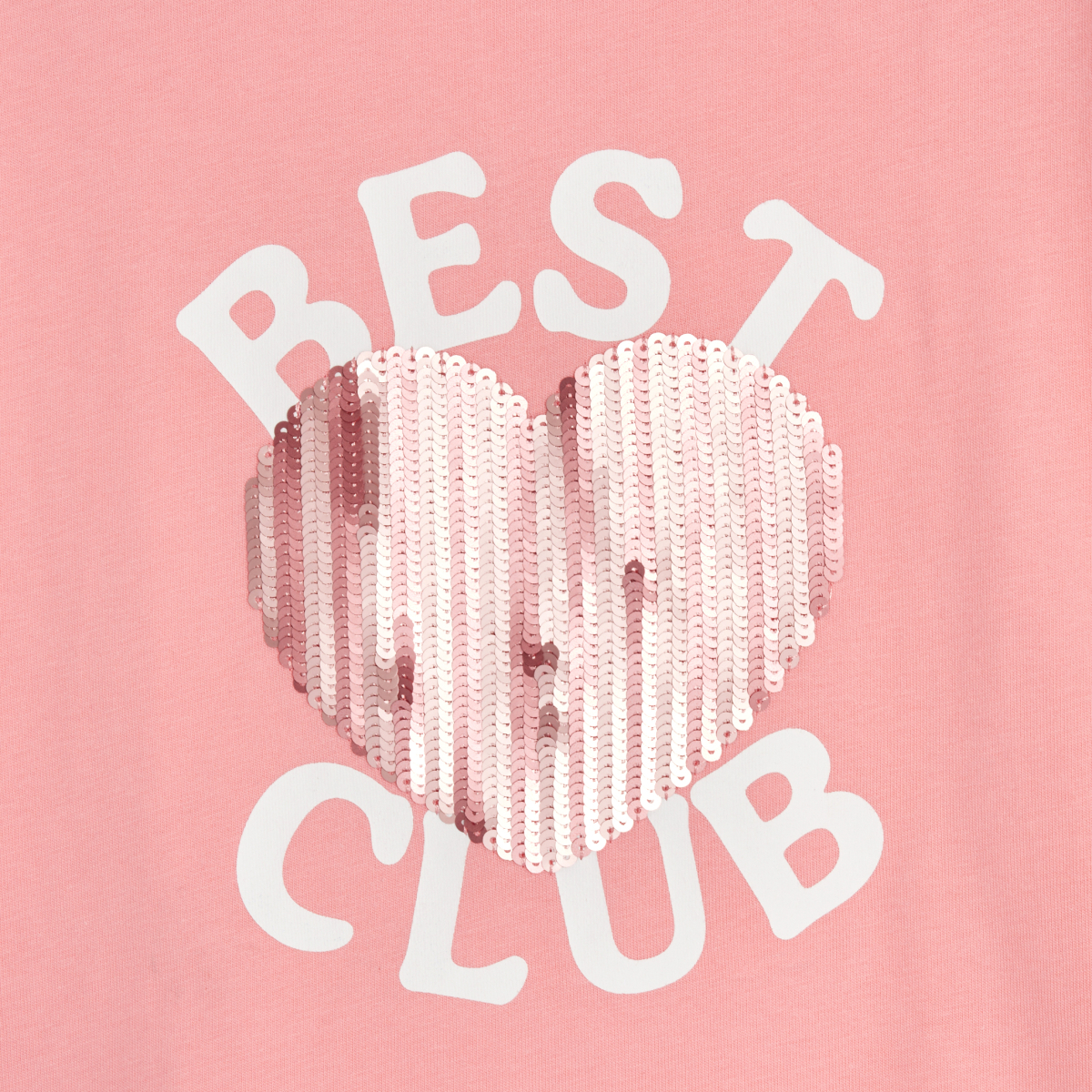 Dès qu'il y a des sequins les filles sont heureuses ! Exemple choisi avec ce t-shirt rose et son grand cœur réalisé en sequins brodés. Jersey doux. Coupe droite. Col rond. Message imprimé. Dos uni. Manches courtes. Base droite. Coutures ton sur ton en finition.