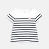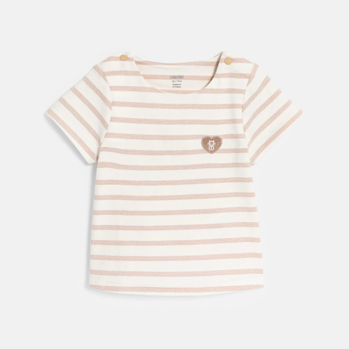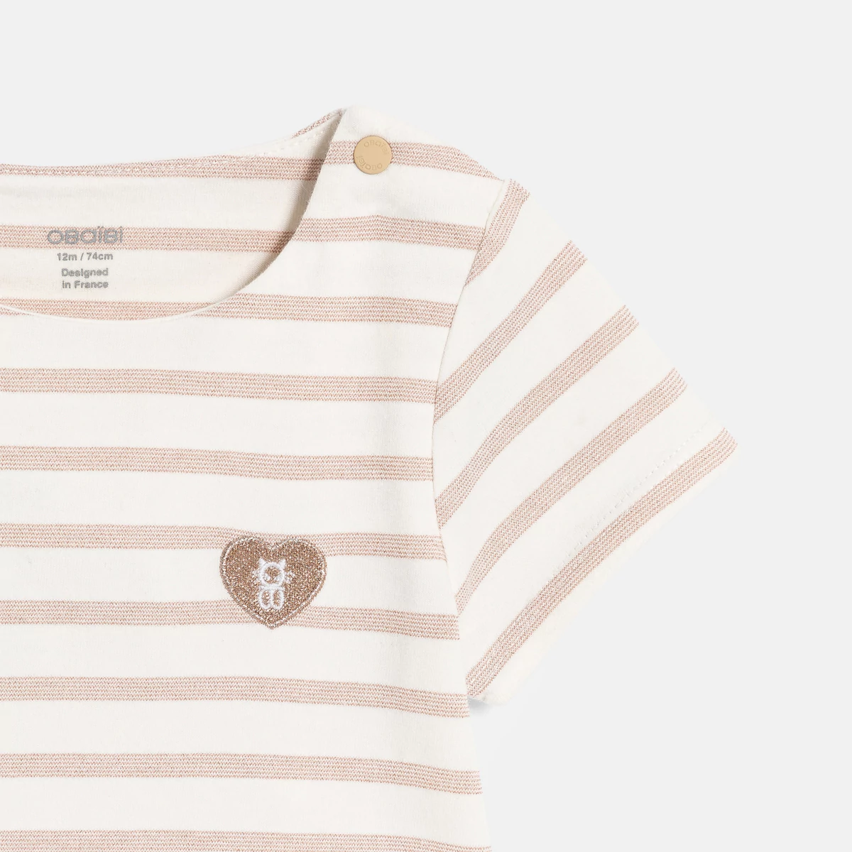 Tee-shirt manches courtes bébé fille. Maille jersey douce en fibres de coton issues de l'agriculture biologique Act for Kids. Encolure ronde pressionnée aux deux épaules pour faciliter le passage de tête. Rayures fils teints. Manches courtes. Patch coeur à la poitrine. Petite vignette Obaïbi en détail.