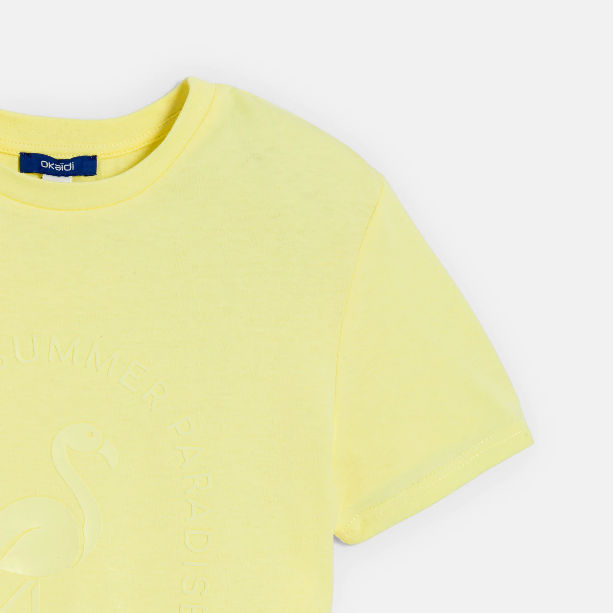 Un flamant rose pour entrer dans lu2019été : c'est toujours une bonne idée ! Exemple choisi avec ce t-shirt jaune à manches courtes. Jersey doux. Coupe courte et droite. Col rond côtelé. Motif imprimé devant dos uni. Base droite. Coutures ton sur ton.