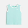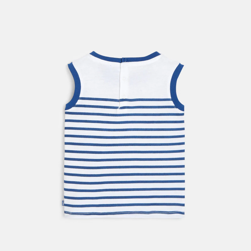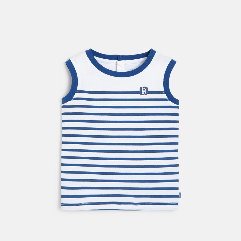 Tee-shirt sans manches forme débardeur bébé garçon. Maille jersey en fibres de coton issues de l'agriculture biologique Act for Kids. Rayures fils teints couleur. Encolure ronde et emmanchures finition bord-côtes couleur uni. Epaule pressionnée pour faciliter le passage de tête. Coupe droite. Petite vignette Obaïbi en détail.